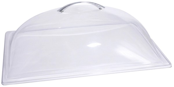 GN-Kuppelhaube, aus glasklarem Polycarbonat mit verchromtem Griff, passt auf alle GN-Tabletts, stapelbar, bis +65°C einsetzbar, sehr robuste Qualität, nahezu unzerbrechlich