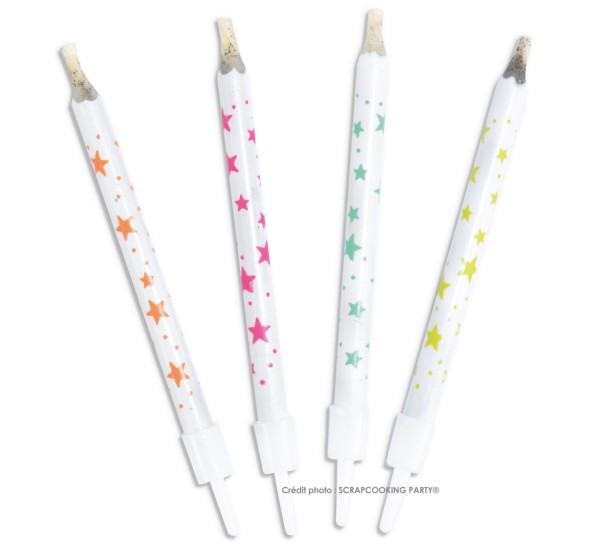 Diese festlichen Kerzen mit bunten Sternen ist eine peppige Dekoration, um einer Geburtstagstorte, Ihren Cupcakes oder anderem Gebäck eine Partystimmung zu verleihen. Einfach in den Kuchen stecken und anzünden, sogleich versprühen sie ein magisches Licht über Ihre süssen Desserts.