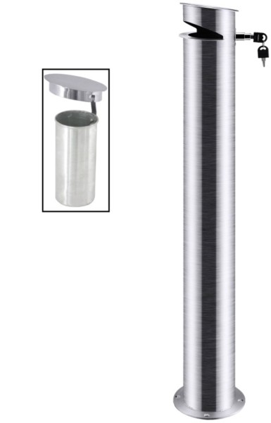 Standaschenbecher, ganz aus Edelstahl, seidenmatt poliert, zur ortsfesten Montage am Boden, abschließbarer entnehmbarer Aschenbehälter